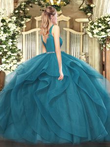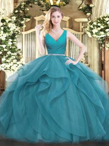 Chic Teal Ball Gowns V-neck Sleeveless Tulle Floor Length Zipper Beading and Ruffles Quinceanera Dresses