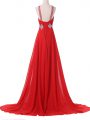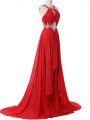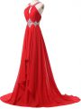 Chiffon Halter Top Sleeveless Brush Train Lace Up Beading and Ruching Womens Evening Dresses in Red