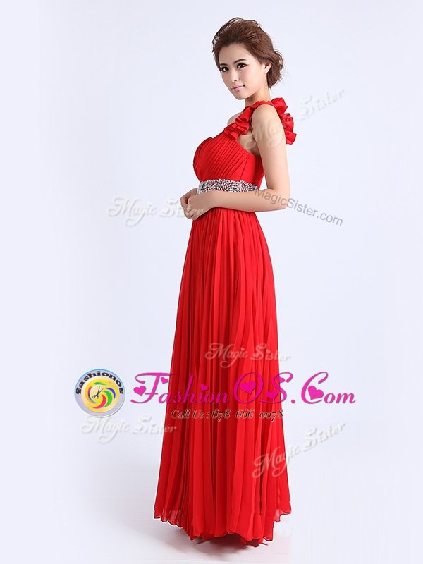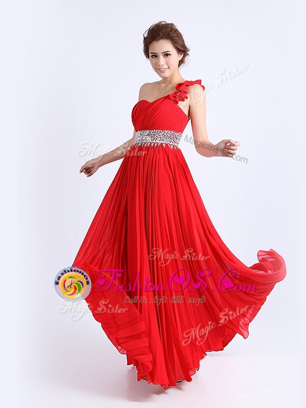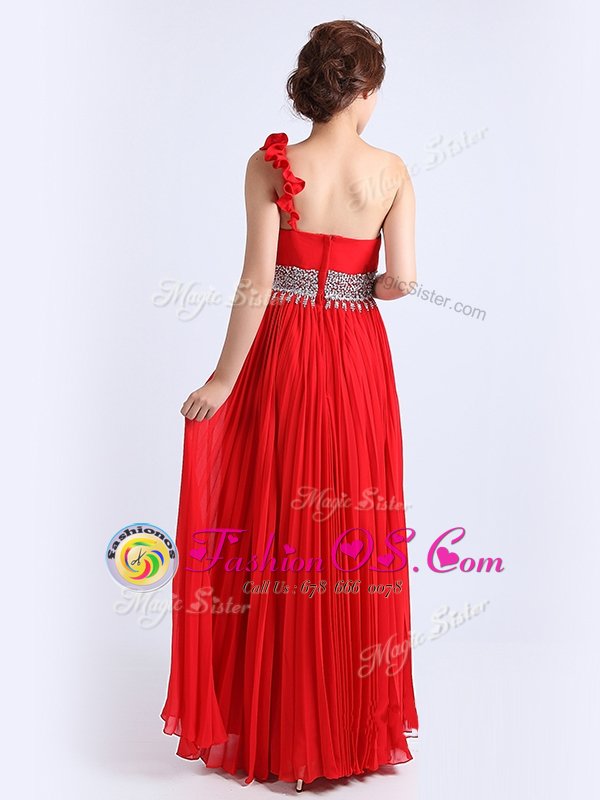 Chiffon One Shoulder Sleeveless Zipper Beading and Ruching and Pleated Evening Dress in Red