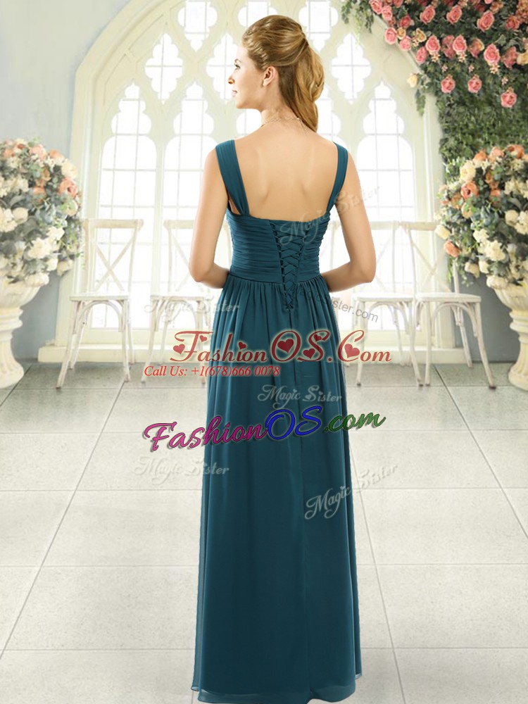 Chiffon Spaghetti Straps Sleeveless Lace Up Beading and Ruching Prom Dress in Olive Green
