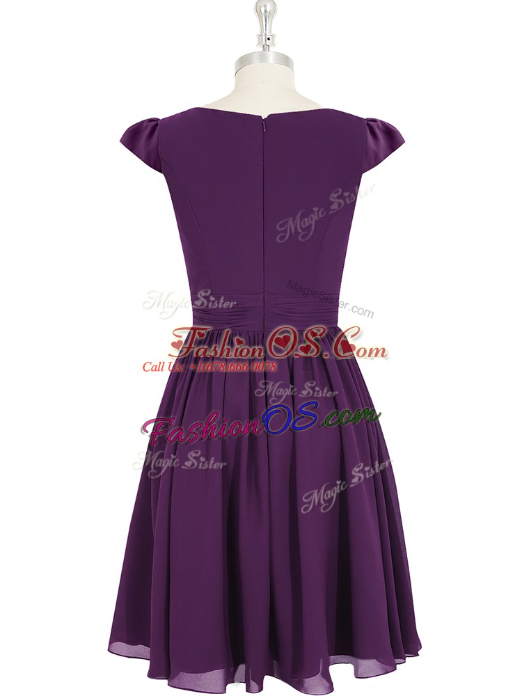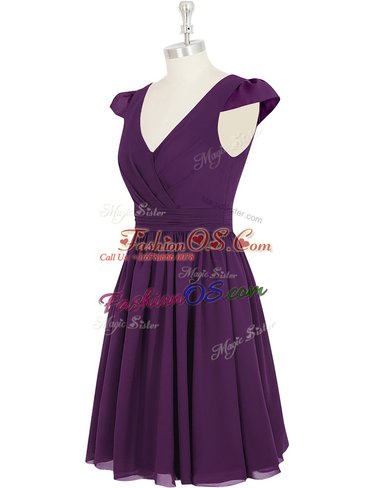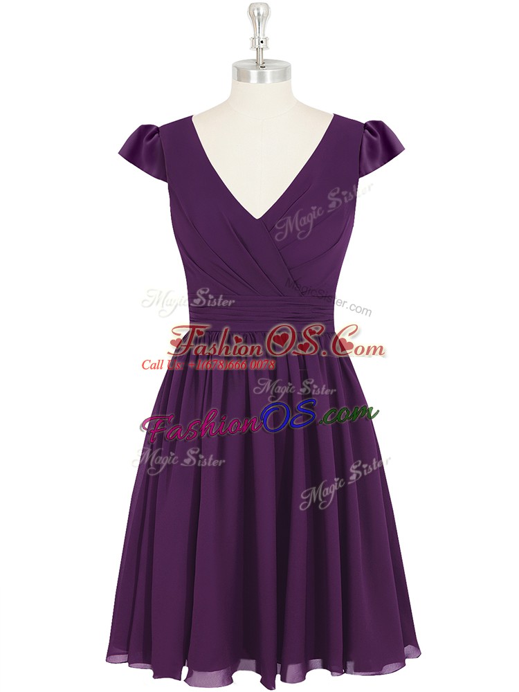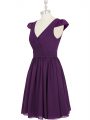Chiffon V-neck Cap Sleeves Zipper Ruching Prom Gown in Purple