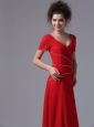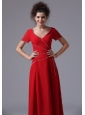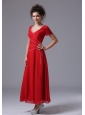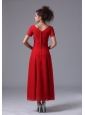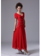 Chiffon V-Neck Column Red Ankle-length Mother of the Bride Dress Short Sleeves