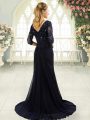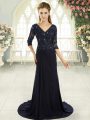 Chiffon V-neck Half Sleeves Sweep Train Zipper Beading and Lace and Appliques Prom Gown in Navy Blue