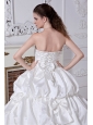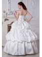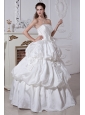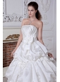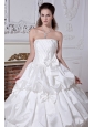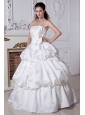 Elegent and romantic.This white wedding dress has a fitted bodice.Beadings and sequins feature the strapless bodice neckline.Pick ups and bows add the charm of this floor length dress.Corset closure can outline your slim figure especially your charming waist.Simple but fashion design is suitable at wedding.