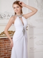 Anyone who love fashion will draw their attention on this beautiful dress! The fashionable halter-top dress is featured with a deep V neckline, which looks sexy yet elegant. The collar nech is encrusted with shining beadings that will add charming and nobleness to you. The ruched bodice perfectly echos the ruched design at the waist which is embellished with a shining brooch. The back design is special for the splay straps and the fabric-covered buttons above the hidden zipper. The sweeping train adds the dress elegance and modesty.
