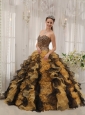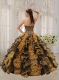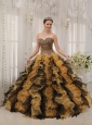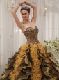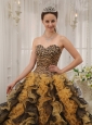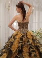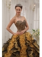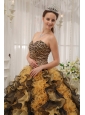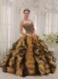 The pretty leopard quinceaera dress features a sweetheart neckline and a colored puffy skirt. The gorgeous skirt is made from many scraps of various colored scrapsand also lines of small tulle flowers, which add to its beauty, fullness and lovely shape. The lace up back finish the look. An amazing dress for those occasions when you really want to 'wow' the crowd.