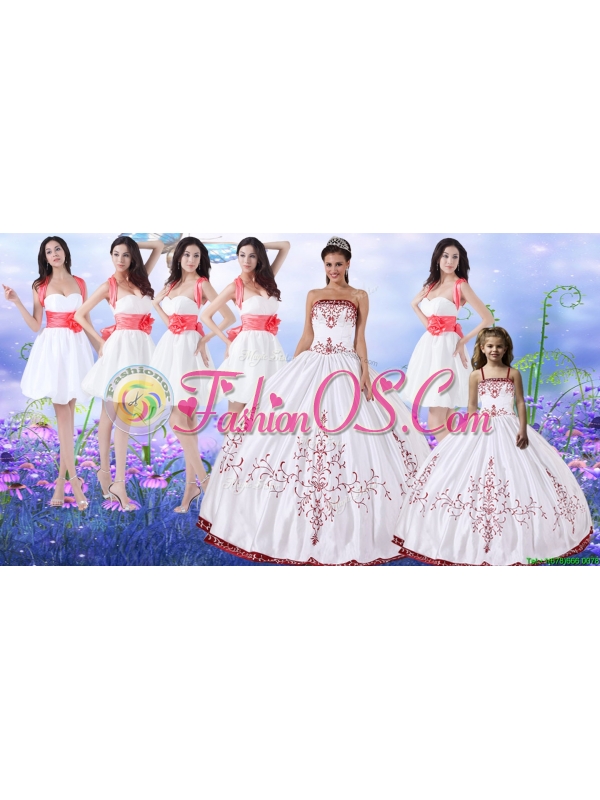 Home >  Quinceanera Dresses >  Quinceaneara Package > Classical Puffy Skirt Strapless Quinceanera Dress and Popular Embroidered Mini Quinceanera Dress and Best Red and White Short Dama Dresses
