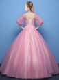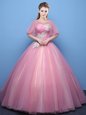 Classical Scoop Half Sleeves Quinceanera Gowns Floor Length Appliques Pink Tulle