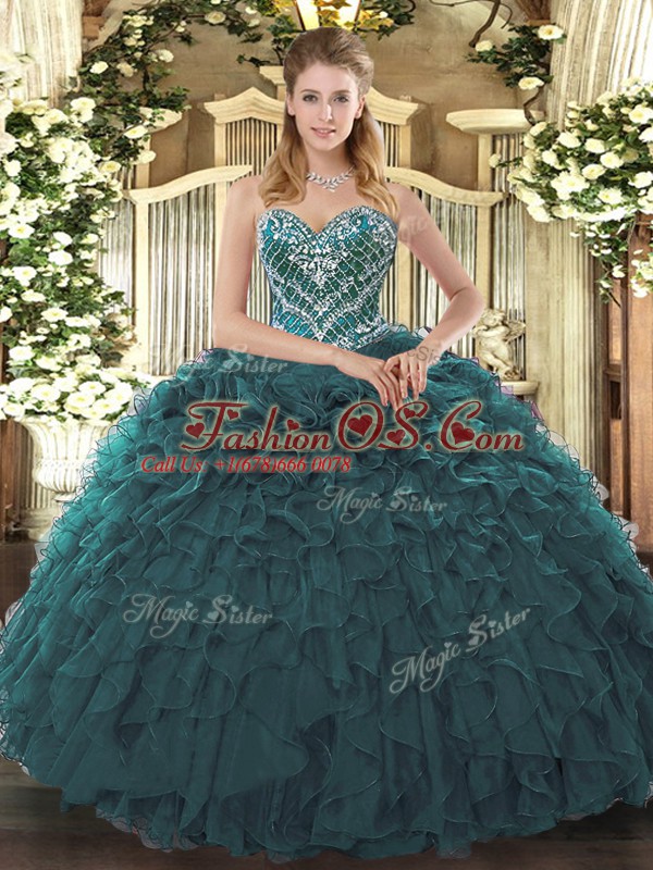 Home >  Quinceanera Dresses >  In Stock Quinceanera Dresses > Classical Teal Tulle Lace Up Sweet 16 Quinceanera Dress Sleeveless Floor Length Beading and Ruffled Layers