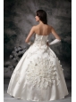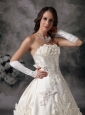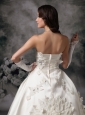 The sweetly flower-accented appliques bodice has a strapless neckline and a seam tailoring for a feminine fit. A delicate band curves the bust that with slices of petalages strikingly. The waist sparkles with dazzling stone details which are on the surface of the gorgeous appliaues. This full skirt is overwhelmed with huge elegant flowers throughout. This gown is a full length and a showstopper for your big day. What's more, a matching gloves for you as perfection.