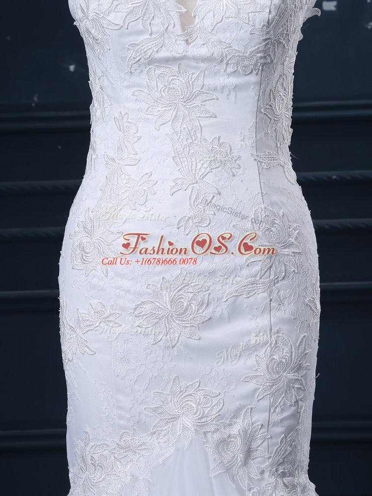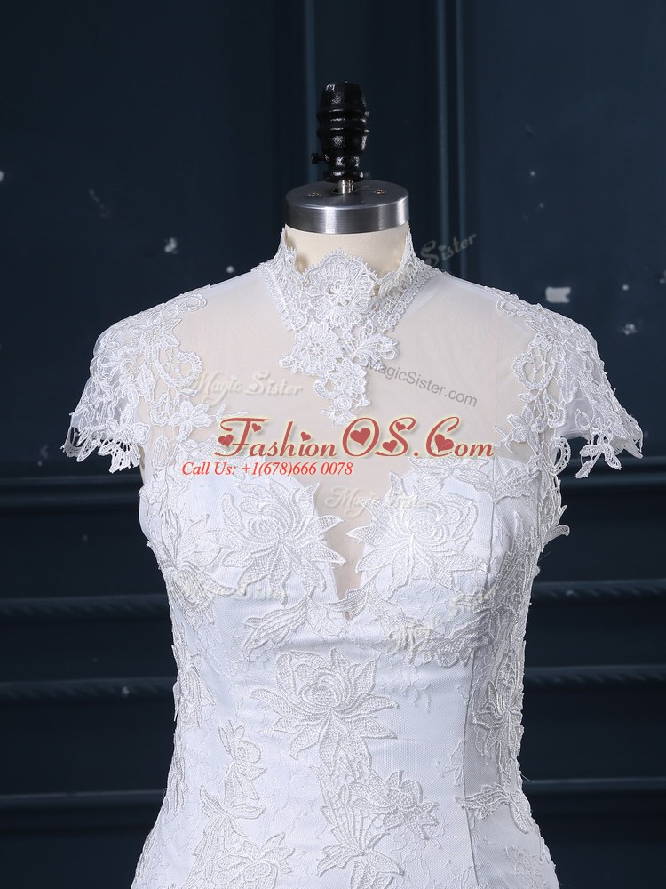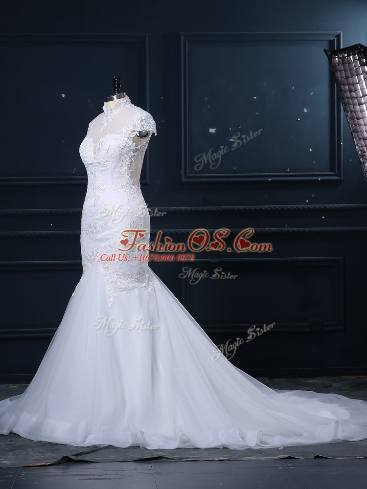 Classical White Mermaid Lace Wedding Dress Clasp Handle Tulle Cap Sleeves