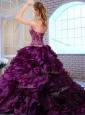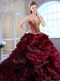Clearance Brush Train Ruffles and Appliques Quinceanera Dresses in Wine Red