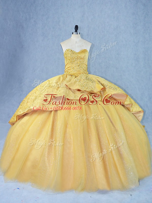 Home >  Quinceanera Dresses >  Quinceanera Dresses 2019 > Clearance Lace Up Sweet 16 Dresses Gold for Sweet 16 and Quinceanera with Beading and Appliques Court Train