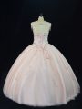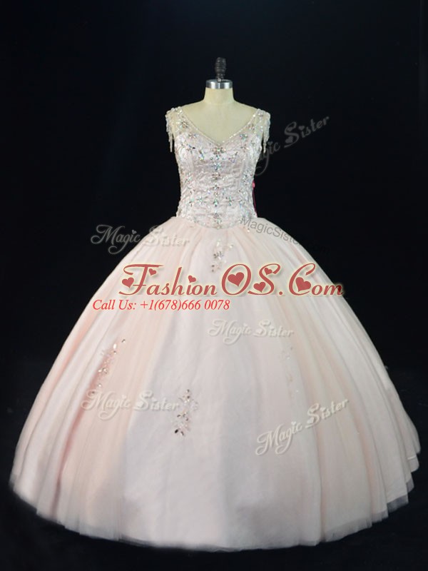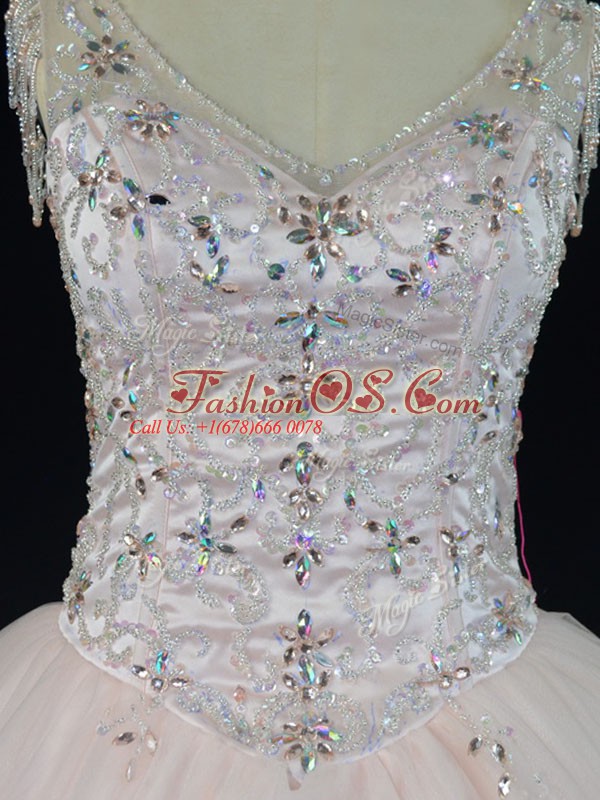Clearance Pink Quince Ball Gowns Sweet 16 and Quinceanera with Beading V-neck Sleeveless Lace Up