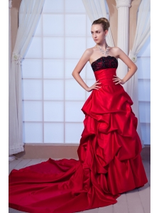 Red A-line Strapless Chapel Train Taffeta Beading and Lace Wedding Dress