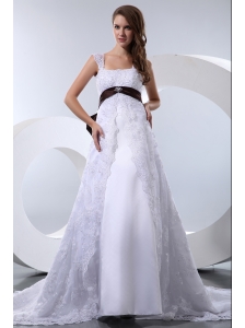 Fashionable A-line Straps Wedding Dress Satin and Lace Bow Beading Chapel Train