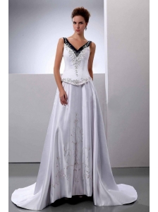 Embroidery A-Line / Princess V-Neck Wedding Dress Court Train Satin