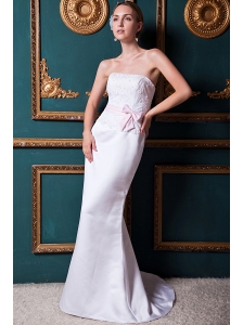 Modest Column Strapless Brush Train Satin Appliques Wedding Dress