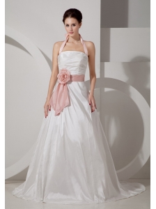 Low Cost A-line Halter Wedding Dress Court Train Taffeta Sash and Ruch