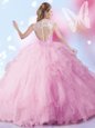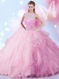 Colorful Baby Pink High-neck Zipper Beading and Ruffles and Sequins Quinceanera Dresses Sleeveless