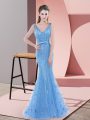 Colorful Beading and Sequins Prom Dresses Baby Blue Backless Sleeveless Sweep Train