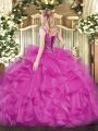 Colorful Floor Length Fuchsia Sweet 16 Quinceanera Dress Organza Long Sleeves Beading and Ruffles