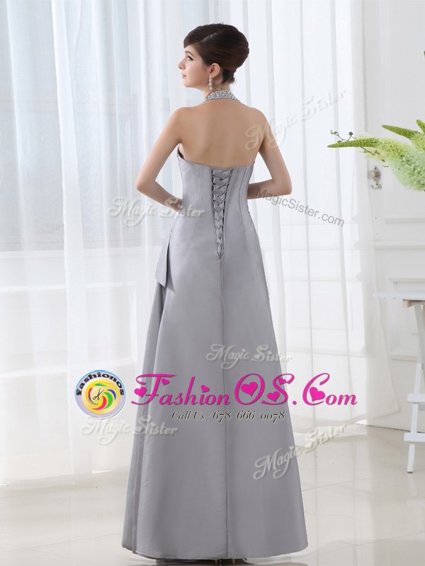 Colorful Grey Lace Up Halter Top Beading and Ruching Dress for Prom Satin Sleeveless