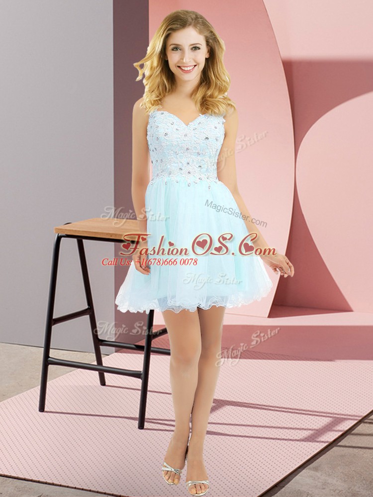 Home >  Special Occasion Dresses >  Cheap Dama Dresses > Colorful Light Blue Dama Dress for Quinceanera Prom and Party and Wedding Party with Beading and Lace V-neck Sleeveless Side Zipper