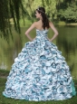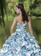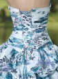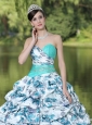 If you are looking for a chic and elegant design for your event, this one will definitely suffice. The gorgeous quinceanera dress features a strapless bodice which is decorated with clear ruching and a sweetheart neckline. The combine of colorful printing fabric and the blue tulle fabric form a sharp contrasting and also makes the dress more delicated. The skirt is fitted and it adorned with many pick ups, creating a lovely silhouette. Just a very flattering design for any body shape or style. Lace up back is fitted the gown.