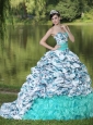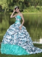 Colorful Printing and Organza Beaded Decorate Waist Pick-ups and Ruffles Brush Train Lovely Style For 2013 Quinceanera Dress