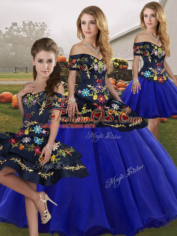 Colorful Sleeveless Tulle Floor Length Lace Up Ball Gown Prom Dress in Royal Blue with Embroidery