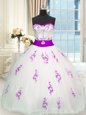 Colorful White Ball Gowns Organza Sweetheart Sleeveless Appliques and Belt Floor Length Lace Up 15th Birthday Dress