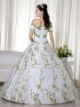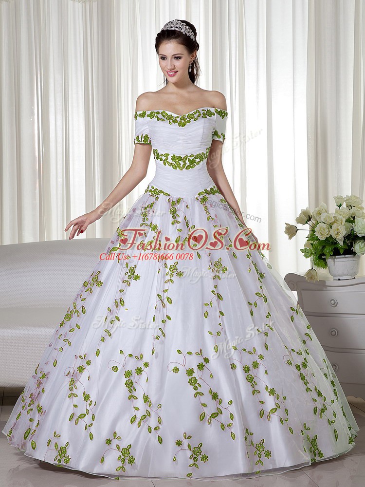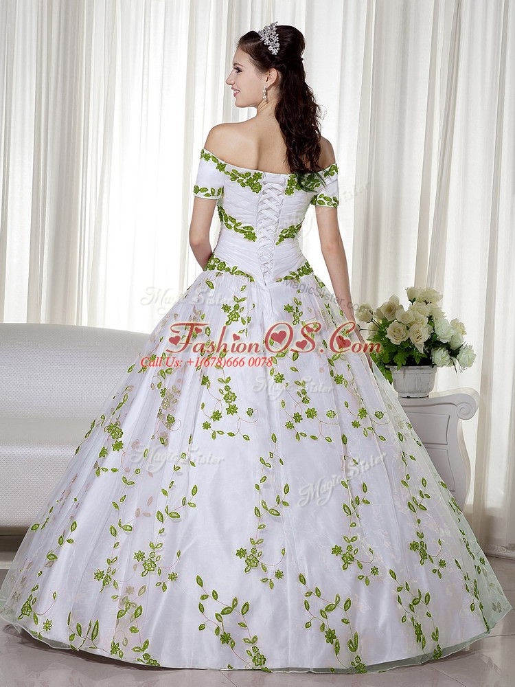 Colorful White Short Sleeves Floor Length Embroidery Lace Up Quinceanera Gown