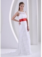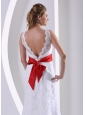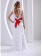 This wonderful wedding dress is accented with a straps top specialized by lace fabric to cover the chest and the mermaid skirt starting from hugging-body waist with a brush train overlayed with beautiful lace, which adds your elegance and upgrades your taste. The red sash and the the sexy deep v-line back finish the look and add the charm.