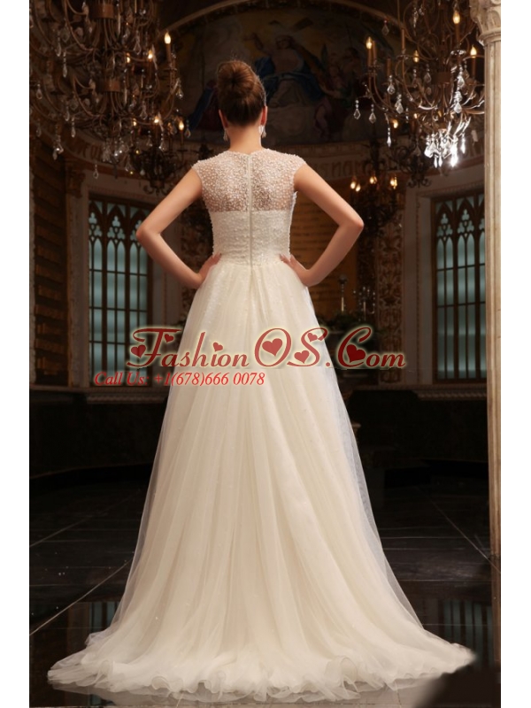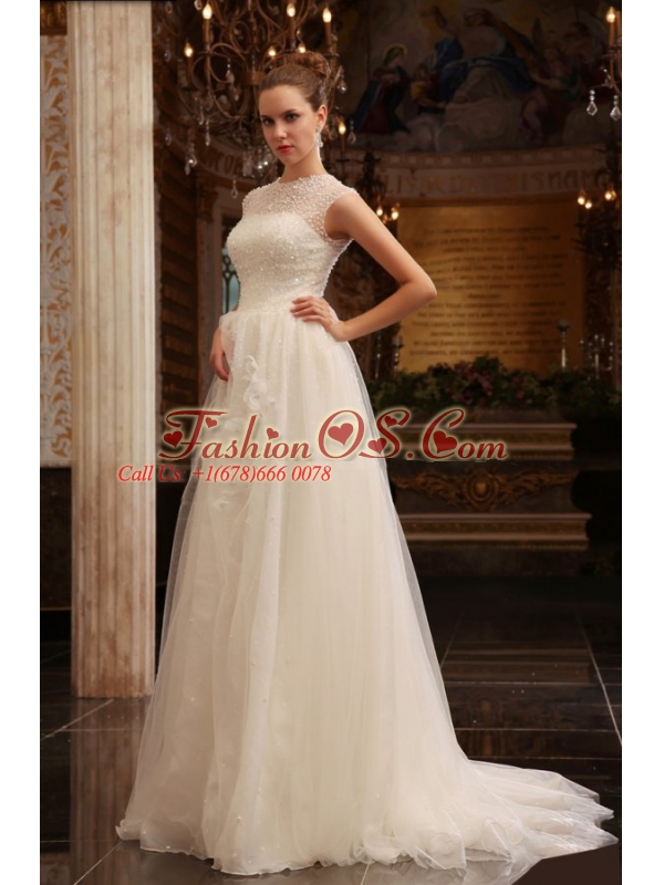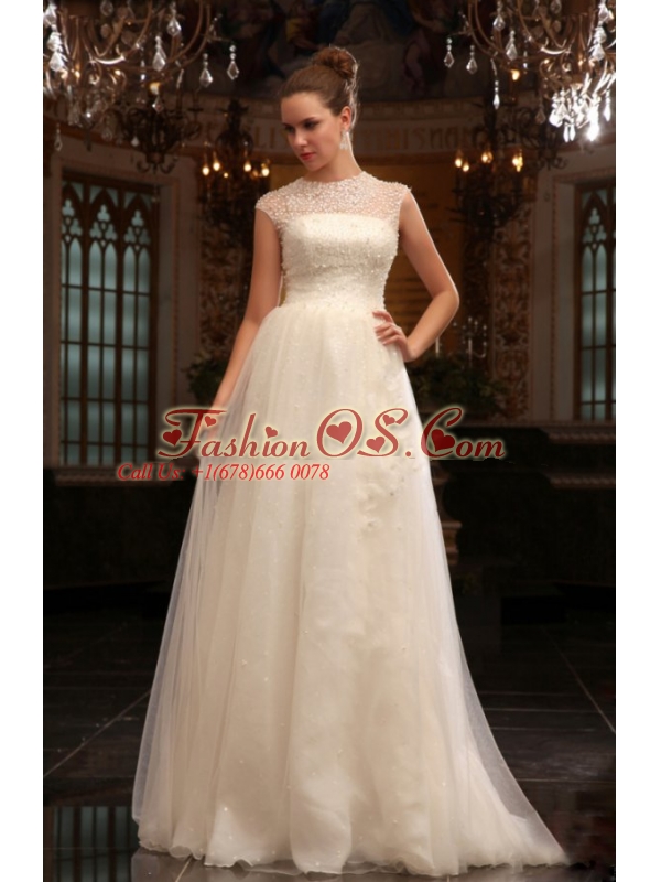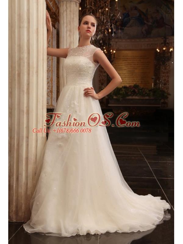 Home >  Wedding Dresses >  Perfect Wedding Dresses > Column Halter Beading Brush Train Organza Wedding Dress