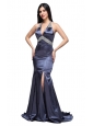 Column Halter Top Beading Navy Blue Taffeta High Slit Prom Dress
