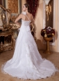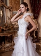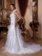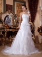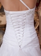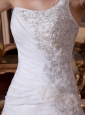 Elegent and romantic! The ruched bodice accented with one shoulder adorned with flowers and applique details flatters most figures. It truly is an example of high end couture fashion. The skirt is a long and winding series of layers that begins at the waist and hips and envelopes the legs in luxurious tulle all the way to the floor. The gorgeous wedding dress is completed with a sweep train. You are sure to be charming and fabulous at your very special day.