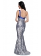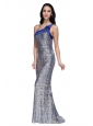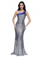 Column One Shoulder Silver Sequins High Slit Brush Train Prom Dress