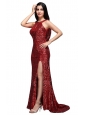 Column Scoop Wine Red Sequins High Slit Brush Train Prom Dress