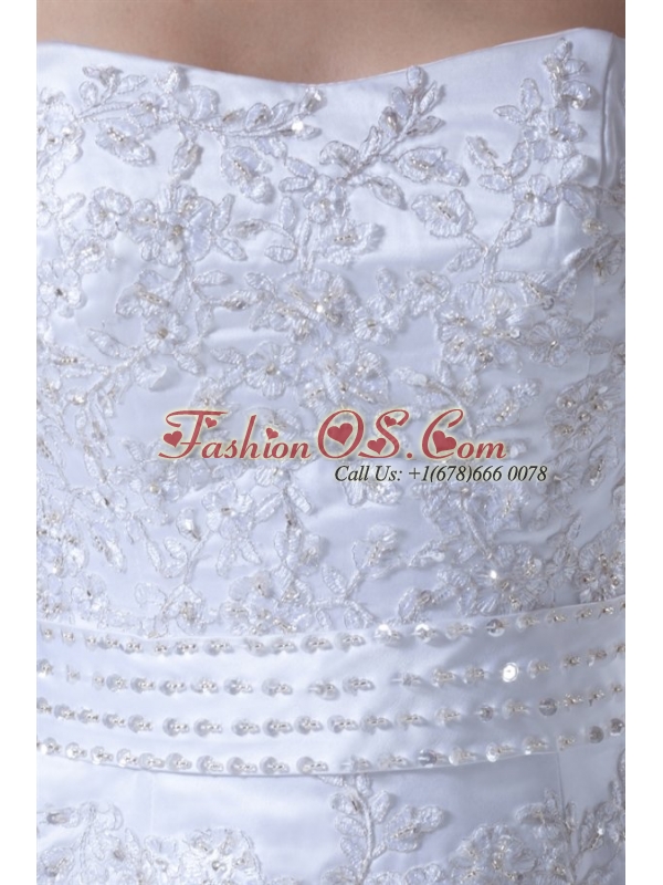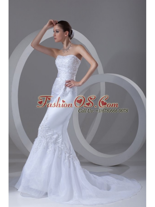 Column Strapless Appliques Court Train Organza Wedding Dress