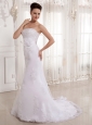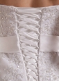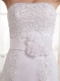 Wow! How gorgeous and glamorous this white wedding dress is! The strapless bodice with straight neckline is fully encrusted with lace and beading embellishments. The coordianted sash is adorned with several hand made flowers, which makes this design so ravishing that will let you attract the public. The skirt flows in clean lines to floor with scattered lacework which accentuates your curve perfectly. You deserve the perfect dress for your wedding.