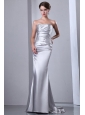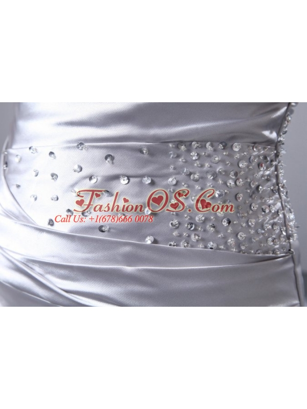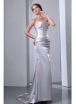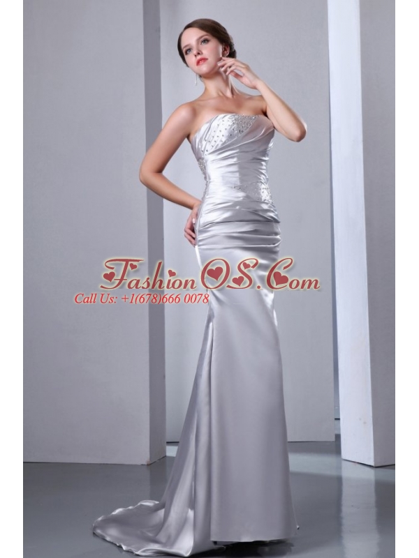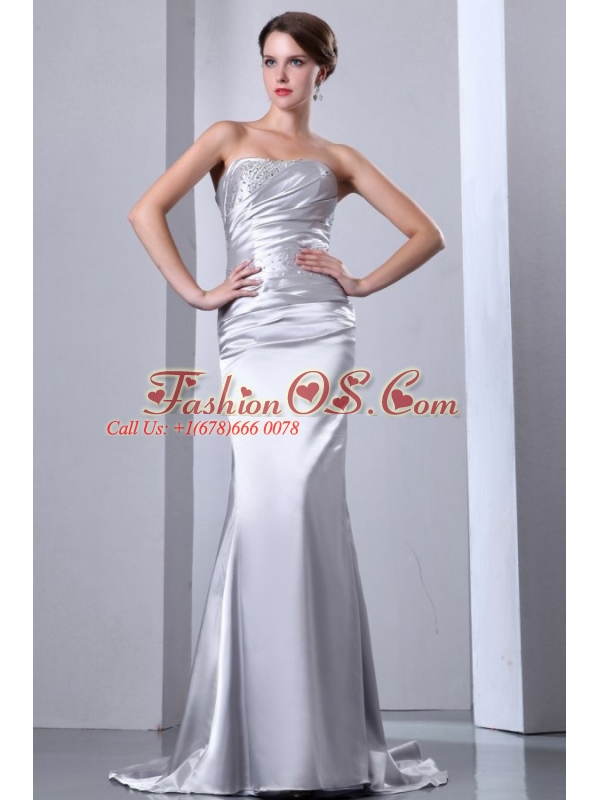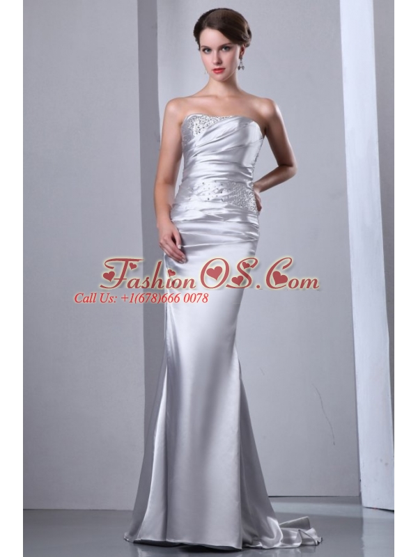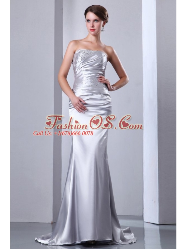Home >  Wedding Dresses >  Perfect Wedding Dresses > Column Strapless Silver Beading Ruching Brush Train Wedding Dress