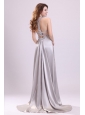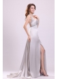 Home >  Prom Dresses >  Fashionable Prom Dresses > Column Straps Beading and Ruching High Slit Watteau Train Prom Dress