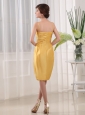 Modest dress with sexy sweetheart neckline and asymmetrically ruches accent the knotted empire bodice. The princess cut dress has a column skirt. This gorgeous yellow dress is made of taffeta. Simple zipper up completes the look. You are sure to be charming and fabulous at your special day.