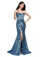 Column Sweetheart Blue Sequins High Slit Brush Train Prom Dress