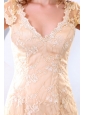 Column V neck Short Sleeves Brush Train Champagne Appliques Prom Dress