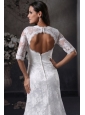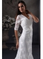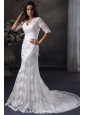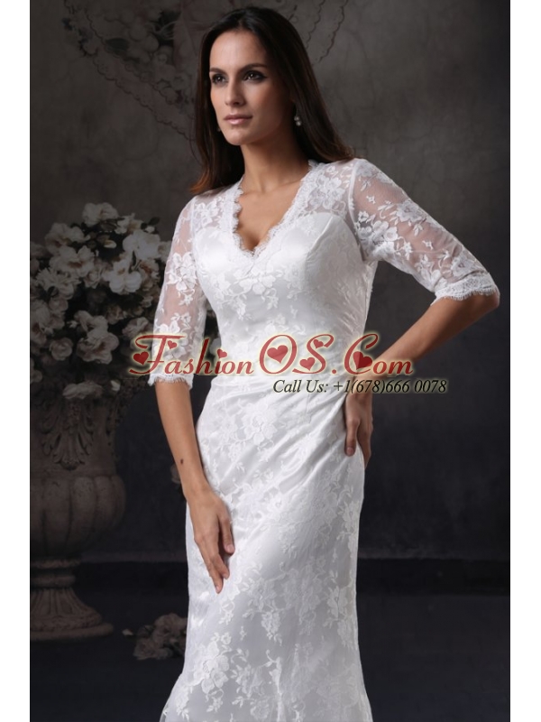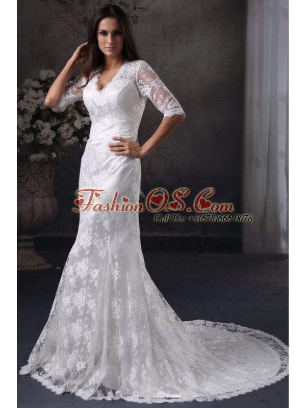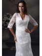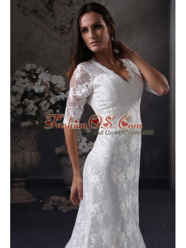 Column V-Neck Open Back Lace Wedding Dress with Court Train