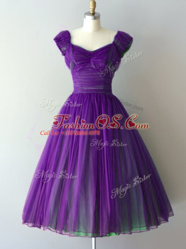 Comfortable Cap Sleeves Chiffon Knee Length Lace Up Vestidos de Damas in Purple with Ruching