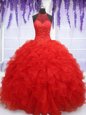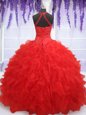 Comfortable Halter Top Floor Length Red Sweet 16 Quinceanera Dress Organza Sleeveless Beading and Ruffles