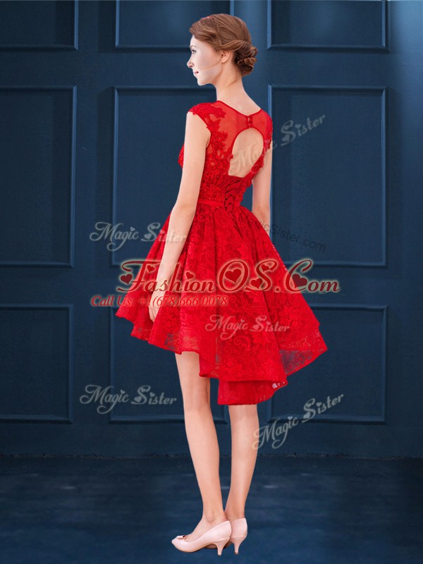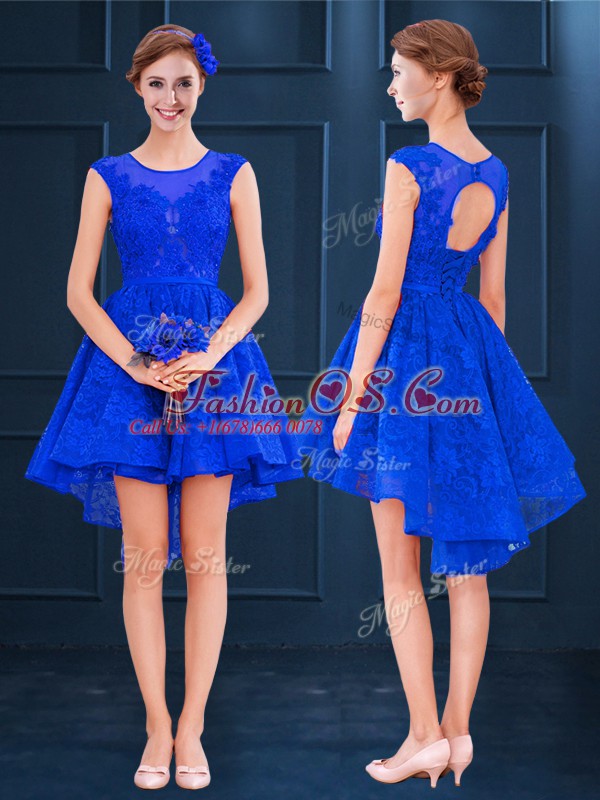Comfortable Royal Blue Scoop Lace Up Lace and Belt Dama Dress Sleeveless